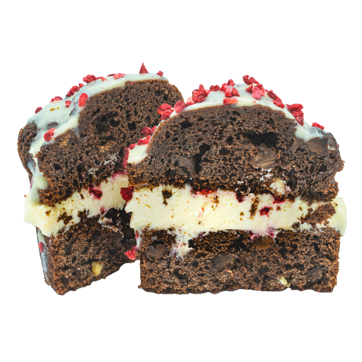 A soft, rich chocolate muffin filled with smooth vanilla cheesecake and topped with white chocolate and raspberry crumbs.